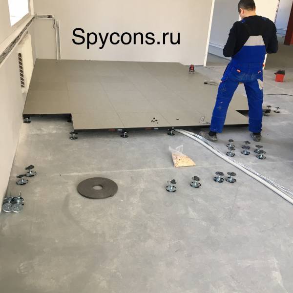 Если говорить о технологии монтажа фальшпола, в начале работы на основание пола монтируются небольшие ножки-подставки для  плит. При этом данные опоры, можно собственноручно регулировать по высоте.